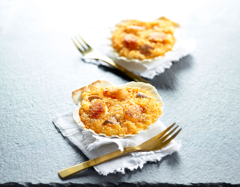 Élaborées dans la pure tradition bretonne, ces coquilles sont cuisinées à partir de noix de Saint-Jacques, de crème, de beurre et de Cognac.